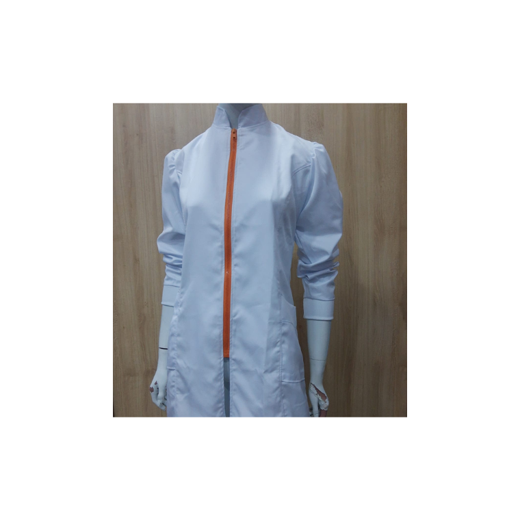 Cor: Jaleco Branco com ziper laranja, manga Princesa.